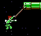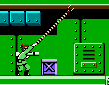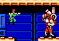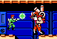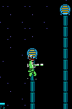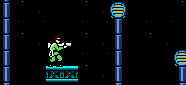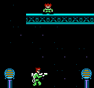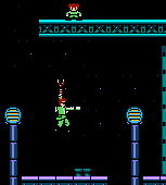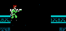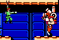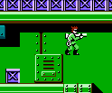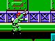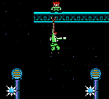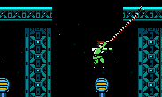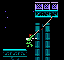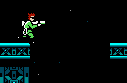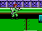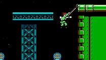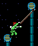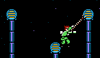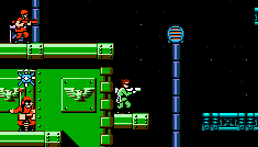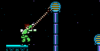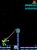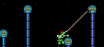 Keep going to the right. Because of all the parachuters, I can't give you a definitive course, but try to hook up whenever you can and keep moving right until you reach the place shown below. When you're there, swing off the light pole and land to the right of the springs. Hook and get up, blast the fat remote controller guy, and keep going right. Watch out for those parachuters. For this next sequence, yes, look at the pictures. But read this anyway. Swing off the first light pole, ignore the second one, and either land on the small platform or just fall. If you fall onto the lower green place, just hook up to the small blue platform and hook up again to get to the top blue platform, which is shown in the picture.
