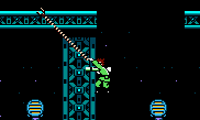 This is a pretty tough level. There are several places requiring precision swinging. If you're a beginner, you may want to stock up on continues by running into those convoys before trying this level. Anyhow, shoot down the barrier and wait for good timing by the light pole. See that tempting free man? Here's how to get it. Swing off the light pole and, while flying through the air, hook straight up. (see the pictures.)