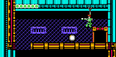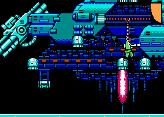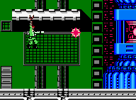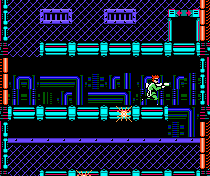 After a few platforms, you'll see a door. Go in. This control/boss room is pretty different from the others you've seen. It's pretty simple, however. Wait for the little gun to shoot at you, then spring up and grab the platform above. Then just shoot twice.