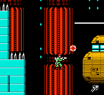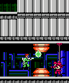 You can get through this small opening without being hit, but it's pretty difficult. It's easier to take the hit. Then keep going down until you reach the bottom, where there's a door. Go inside, and you'll find that that it's a control room, much like the last one: small, with springs, and with a single platform. However, in this room, there's a stream of parachuters you'll have to take care of. They never stop, so just wait for good timing, then spring up and shoot the generator. Simple. Get back out.