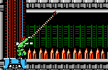 Now you have to go back up. It's easy, though. Just hook straight up, wait for good timing, and get on the platform. Then hook straight up to the next platform, wait for good timing, and get on the platform. Continue this process until you reach the top. Go back through the door. Walk to the left and go down the elevator, all the way to the bottom. There are two guys here, one behind a barrel, and one walking along on the left of the barrel. Kill 'em both, then walk left. Pass this orange barrier, then go down the platform all the way. Notice the spikes on the right (gasp!). This row of spikes extends for a pretty long time. Swing off to the right, then swing off again, and again, and again, until you reach the other side.