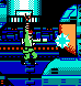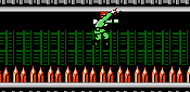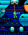 Either way, try your luck at destroying the thing. When you do, you'll end up at an hangar. Run left and swing over the gap of spikes. You'll see a guy standing there. Talk to him. He'll tell you he's Hal and give you the Hyper Bazooka. Its shot looks just like the rocket launcher's, however. Well, you have to now swing off to the right and blast the helicopter's cockpit as you fall. The easiest way to do this is to stand on the right of Hal, where you see the gray marks in the ground. Stand on these marks, as shown below in the pictures. Then swing off to the right and blast the helicopter's cockpit. If you stand more to the left, you might not be able to shoot the cockpit. If you stand more to the right, your reflexes must be faster.