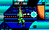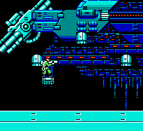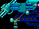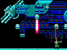 Go in the door on the right. You'll see Killt again. Go to the right, and you'll talk with him. Then he blows up, and Master-D comes out. He talks to you, then you're pitted against the Albatros. On the upper right section of this mechanism is a glowing curved object. You need to shoot this part. There are two methods I use to destroy this. Both are relatively difficult, however, so be prepared. The first way is shown below. You walk to the right until you're under the left fire-shooting thing. Then you hook straight up twice very quickly, then shoot a few times.